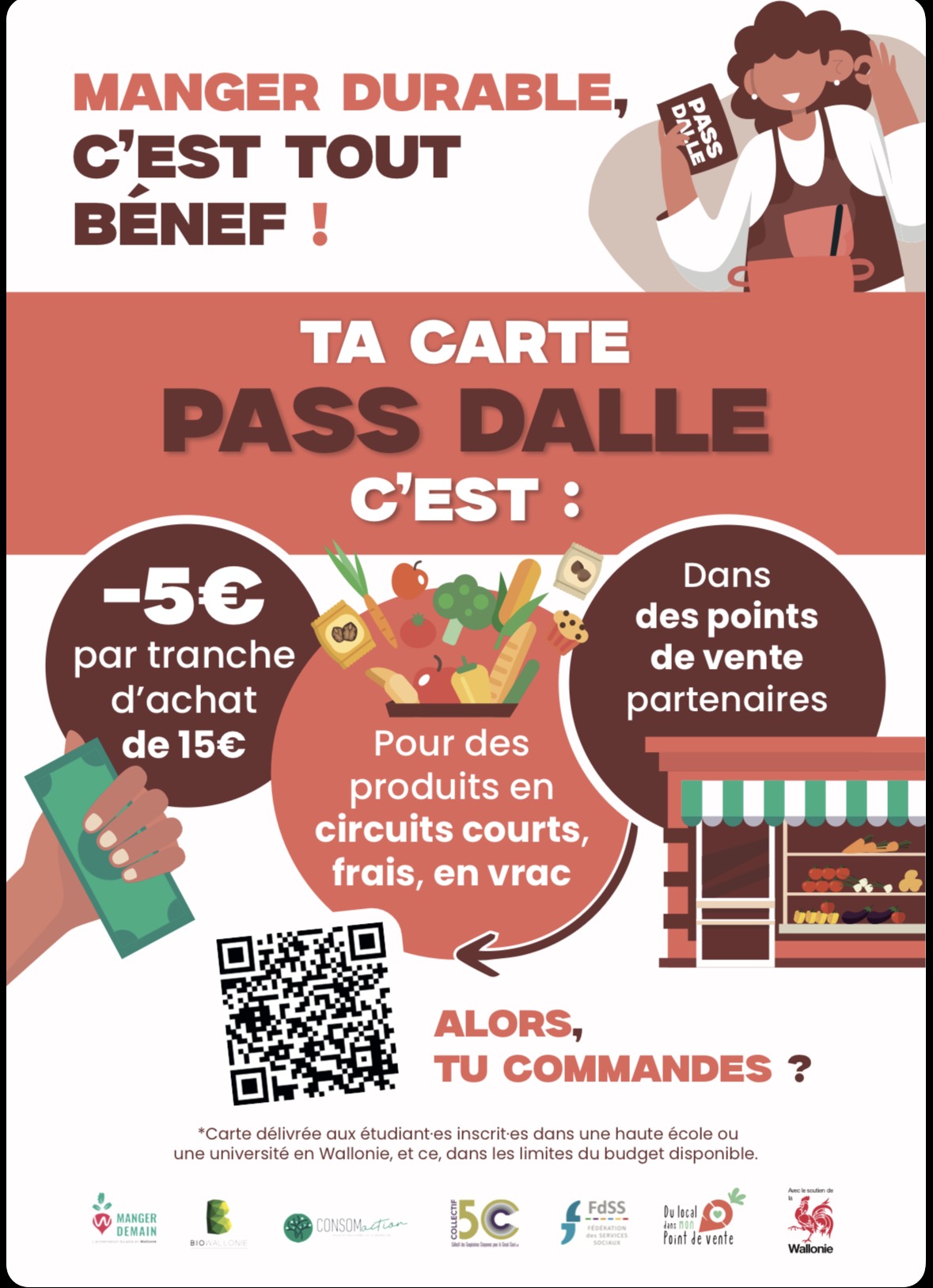 👉 Grâce au PASS DALLE, les étudiants bénéficient de 5 € de réduction par tranche d’achat sur nos produits locaux, frais et en vrac 🥕🧀🍎